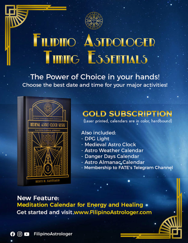 Astrology Products Package 3: Filipino Astrologer Timing Essentials 2022, Gold Subscription Astrology Products PackageGOLD SUBSCRIPTION Get our Astrology Products Package in book format. Our FATE Gold subscription packages help you navigate 2022 wisely. The Gold package is exclusive to our loyal subscribers. Books come in hardcopy. Book 1: Medieval Astro-Clock: Plan with Classical Astrology Item…